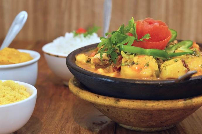 Azeite de dendê, leite de coco, pimentões, tomate, cebola, coentro e, filé de camarão Rosa. Preço para 1: R$72,00 Preço para 2: R$120,00