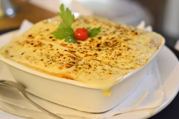 Lasanha feita com fatias de beringela, purê de batata, molho rose e queijo gratinado.